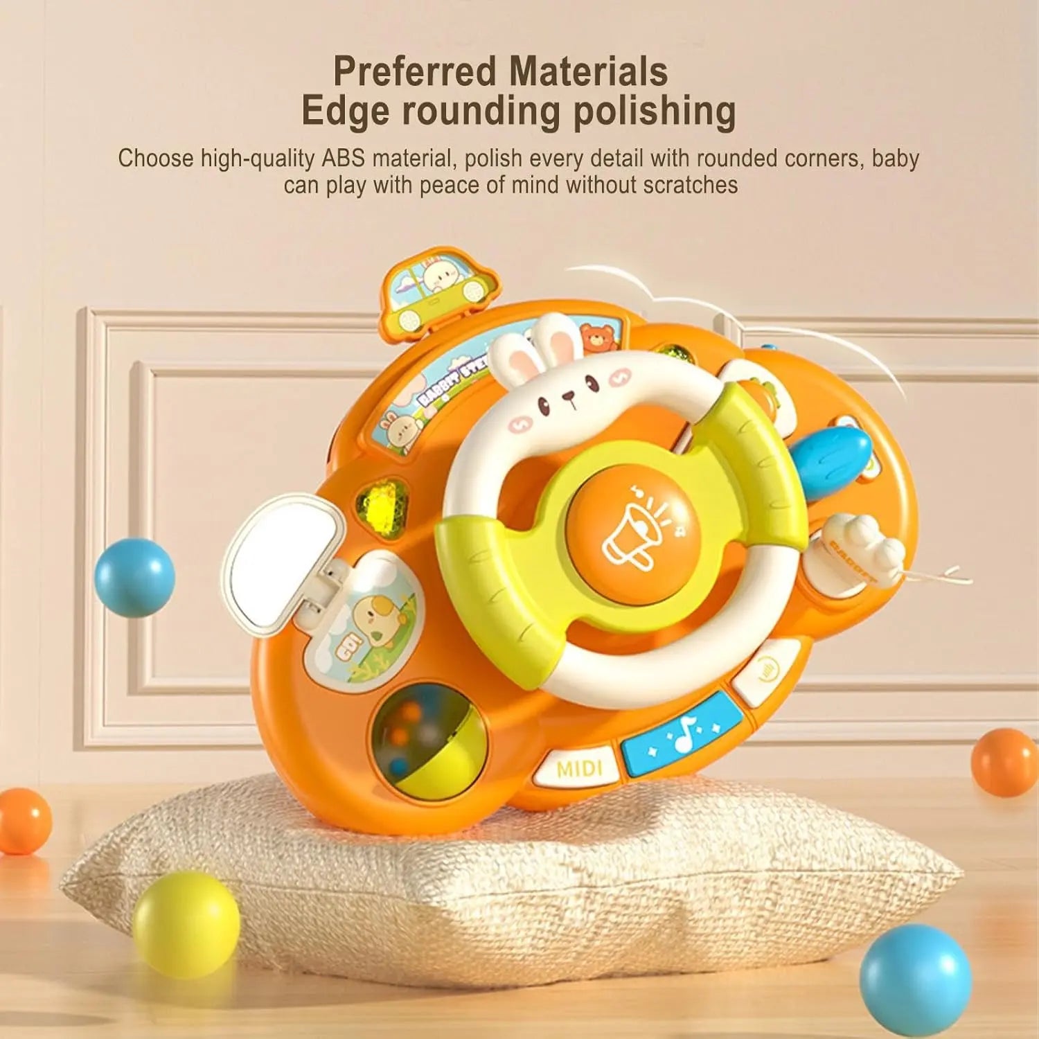 Beyond driving, it’s a music station! Press the "MIDI" button to play cheerful melodies that soothe and entertain your baby. The vibrant orange and green colors, along with the rolling rattle ball and side mirror, provide excellent visual stimulation.
